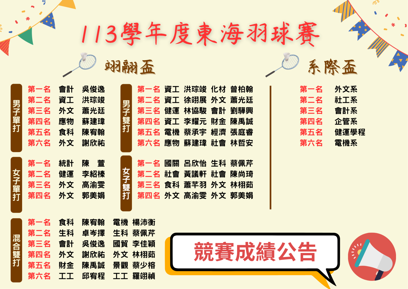 113學年度校內球類競賽-成績公告