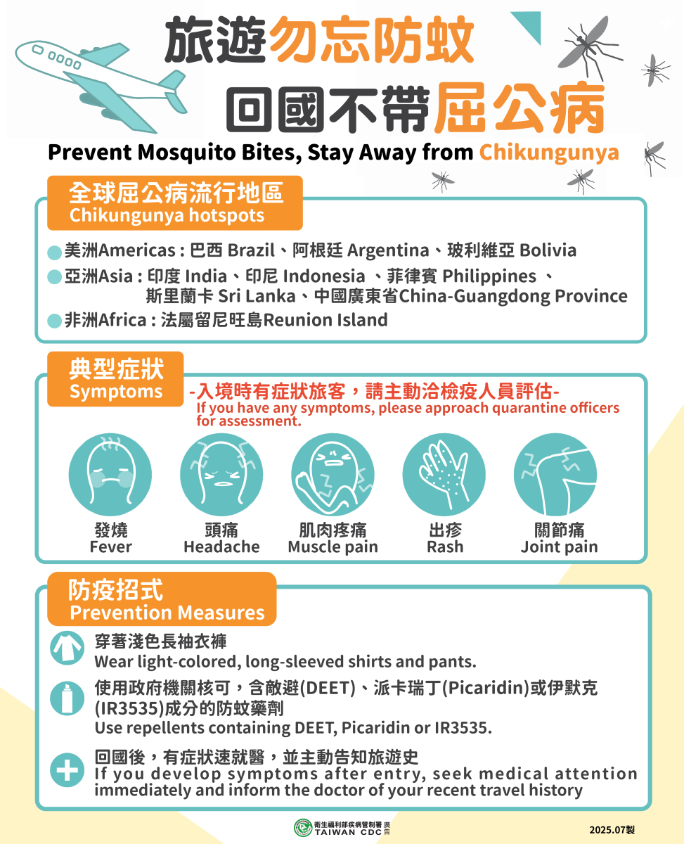 因應國際屈公病疫情升溫,若暑假期間有旅遊史,請留意自身健康狀況。